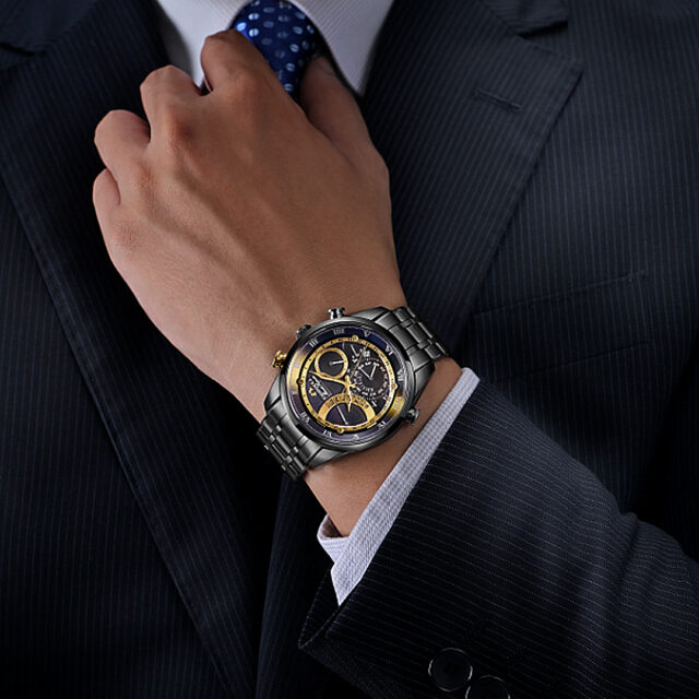 プッシュボタンと合わせて、ゴールドが腕元で印象的に映えます。