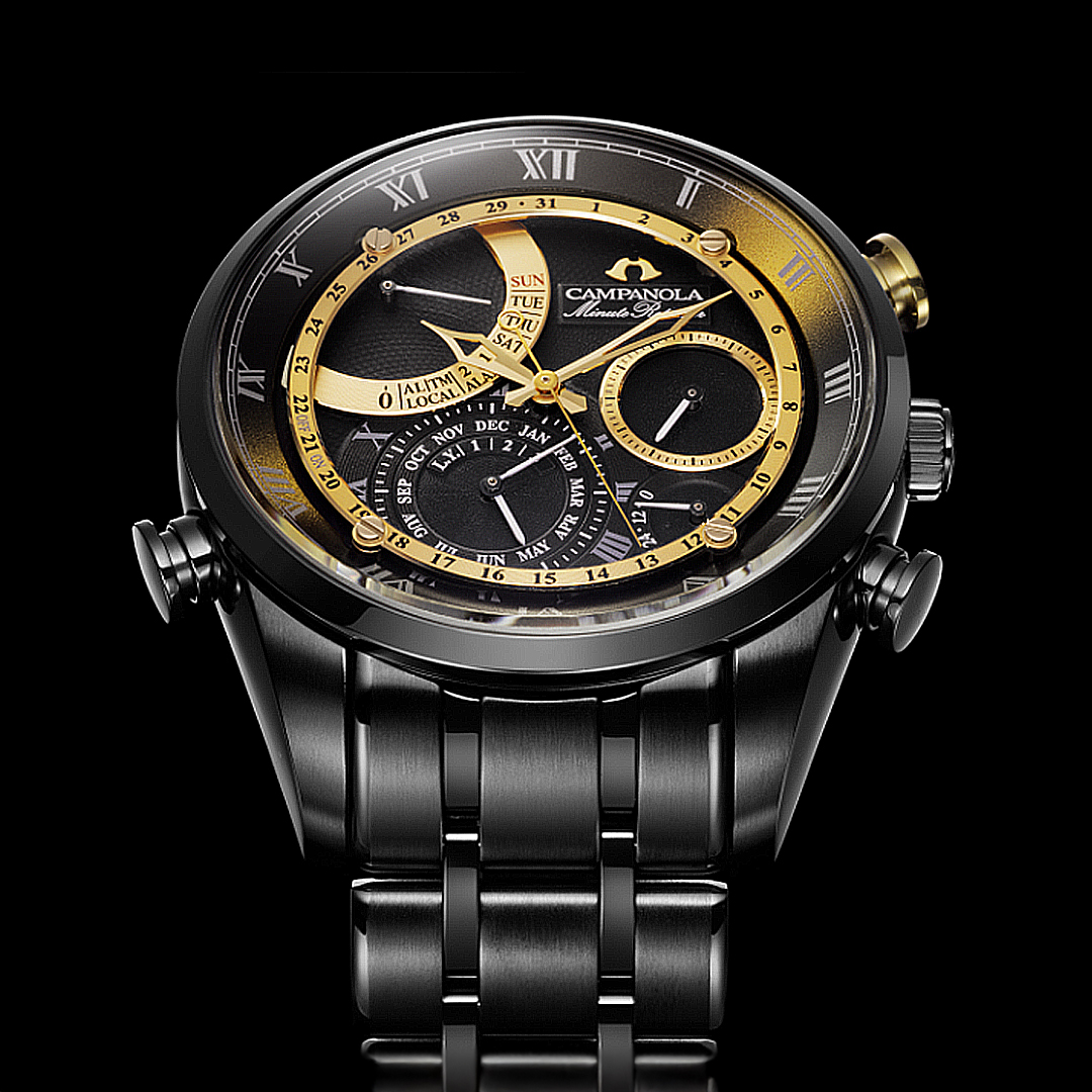 文字板には正確に再現した月の満ち欠けをディスプレイし、月齢はもとより、月と太陽の位置、太陽の出没時刻を表示。