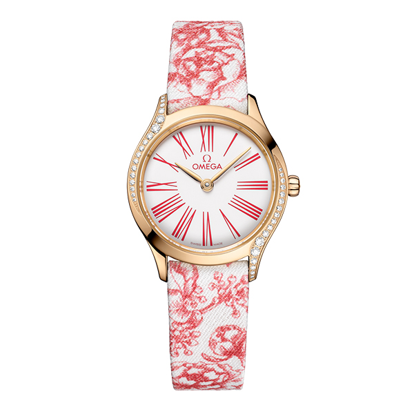 この時計には、優雅に咲き誇る花を描いたレッドフローラル デザインのユニークなトワル・ドゥ・ジュイ ファブリックのストラップがセットされています。鏡面仕上げと「Her Time」のパターンが施されたメタリック加工のサファイアクリスタル製のケースバックにはオメガ キャリバー 4061が搭載されています。